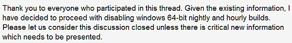 La decisione nasce da un confronto interno tra gli sviluppatori. Sono emersi problemi relativi ai plug-in indisponibili a 64bit, ma soprattutto traspare il fatto che Firefox a 64bit non sia una priorità per Mozilla. E piuttosto che proporre un prodotto insoddisfacente è preferibile dedicare maggiori sforzi allo sviluppo del ramo a 32bit e a tutte le altre novità.