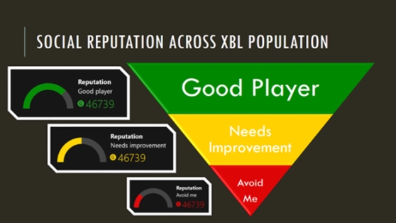 Secondo Lavin, il nuovo sistema di reputazione, che sostituisce il sistema a cinque stelle attualmente utilizzato su Xbox 360, mira a evitare che "una piccola fetta dei giocatori rovini l'esperienza della maggior parte dei giocatori. Dobbiamo essere in grado di individuare i giocatori molesti", dice Lavin.