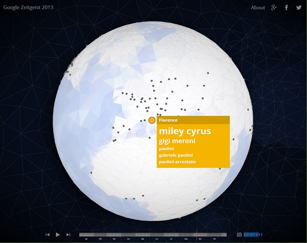 Zeitgeist è un portale in cui Goole racconta a cadenza annuale i 12 mesi antecedenti attraverso i contenuti dei propri servizi online e le ricerche più popolari dell'anno, specificando gli eventi, i trend e i prodotti che hanno segnato l'anno in corso. La società ha appena pubblicato lo Zeitgeist 2013.